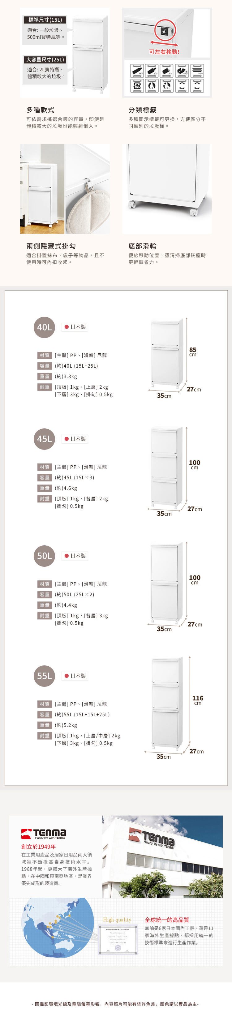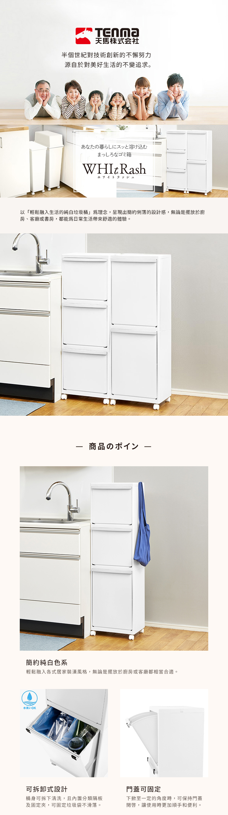 【日本天馬】日本製 WHItRash 雙層抽屜式分類垃圾桶(附輪)-40L