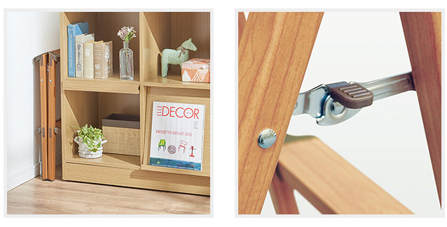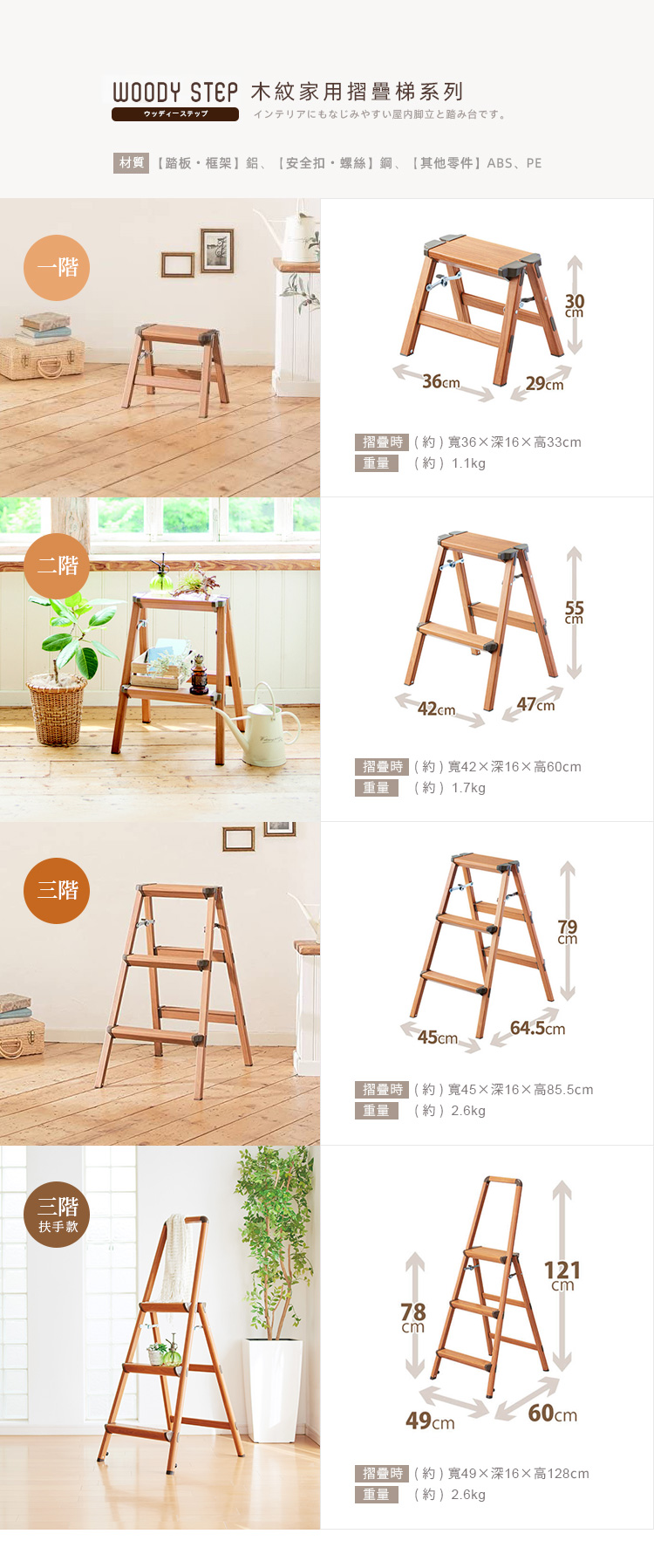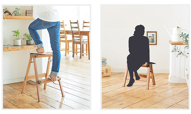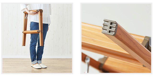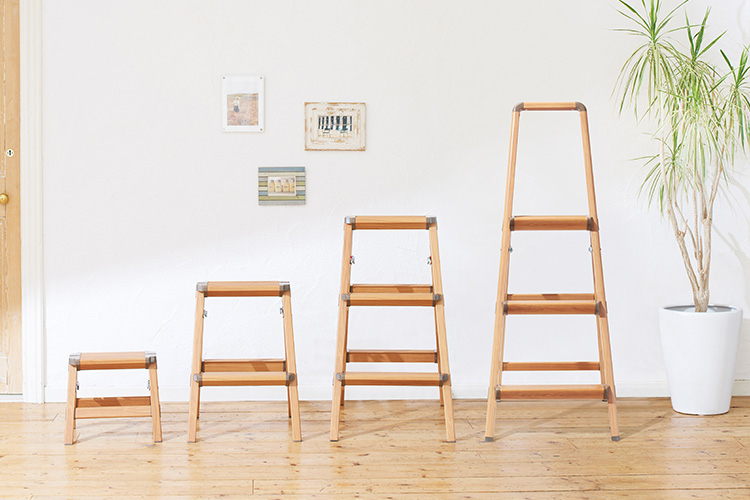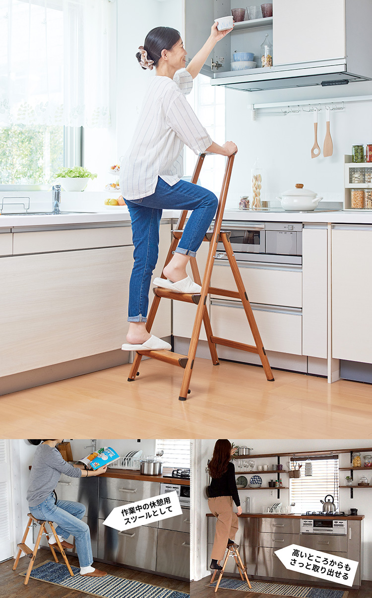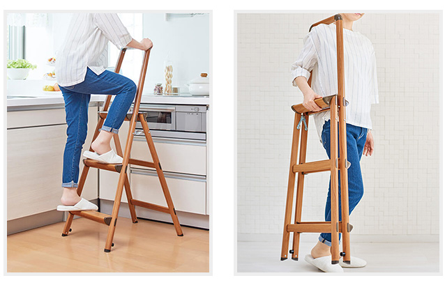 インテリアにもなじみやすい、木目柄がおしゃれな脚立です。アルミ製で軽く、持ち運びも楽々。折りたたむとコンパクトに収納できます。
